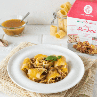 Το My Cooking Box περιλαμβάνει όλα τα τυπικά Ιταλικά υλικά, υψηλής ποιότητας και στις σωστές δοσολογίες για να μαγειρέψετε ένα νόστιμο Mezzi Paccheri του Gragnano IGP, με Κίτρινες Αποφλοιωμένες Τομάτες και Κοιλιά Τόνου, υπογεγραμμένο από τον Σεφ Roberto Proto, με ένα αστέρι Michelin.
