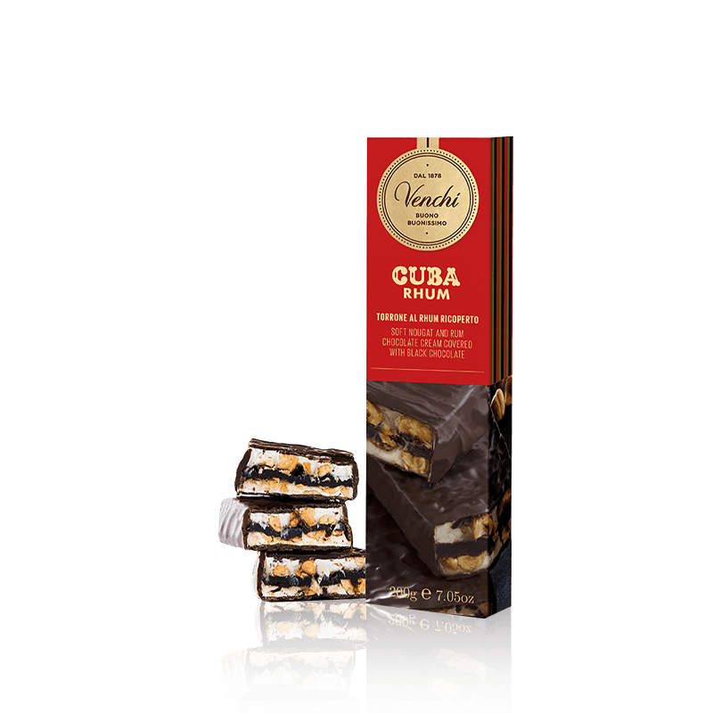Νουγκάτ με αμύγδαλο, ρούμι Καραϊβικής και επικάλυψη μαύρης σοκολάτας.