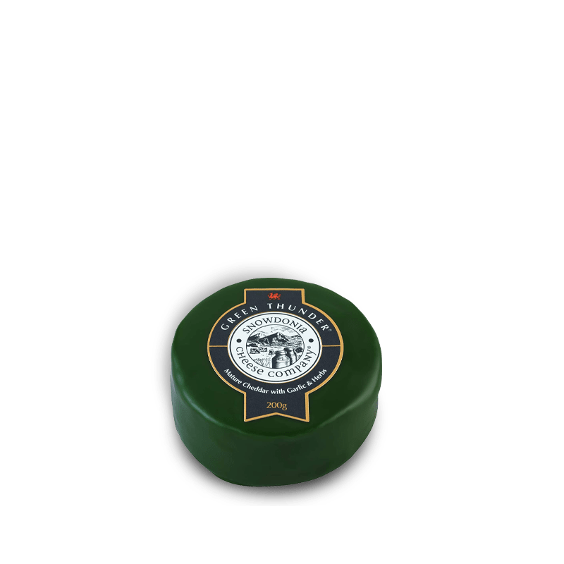 Το Green Thunder είναι ένας δελεαστικός συνδυασμός ώριμου τσένταρ, αρωματισμένου με σκόρδο και βότανα της Snowdonia Cheese Company. Έχει κερδίσει χρυσό βραβείο στα World Cheese Awards και ασημένιο βραβείο στα Nantwich International Cheese Awards. Μπορείτε να το απολαύσετε λιωμένο σε μπιφτέκι βοδινού ή κοτόπουλου, με κράκερ και chutney ντομάτας.